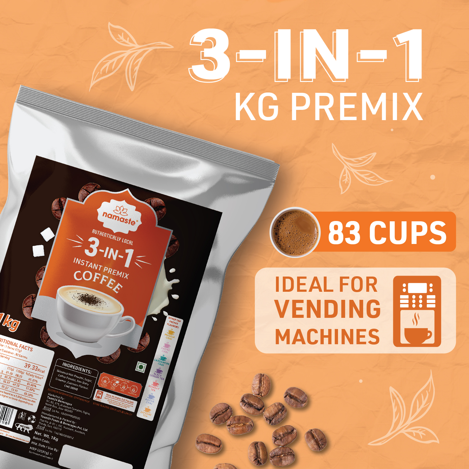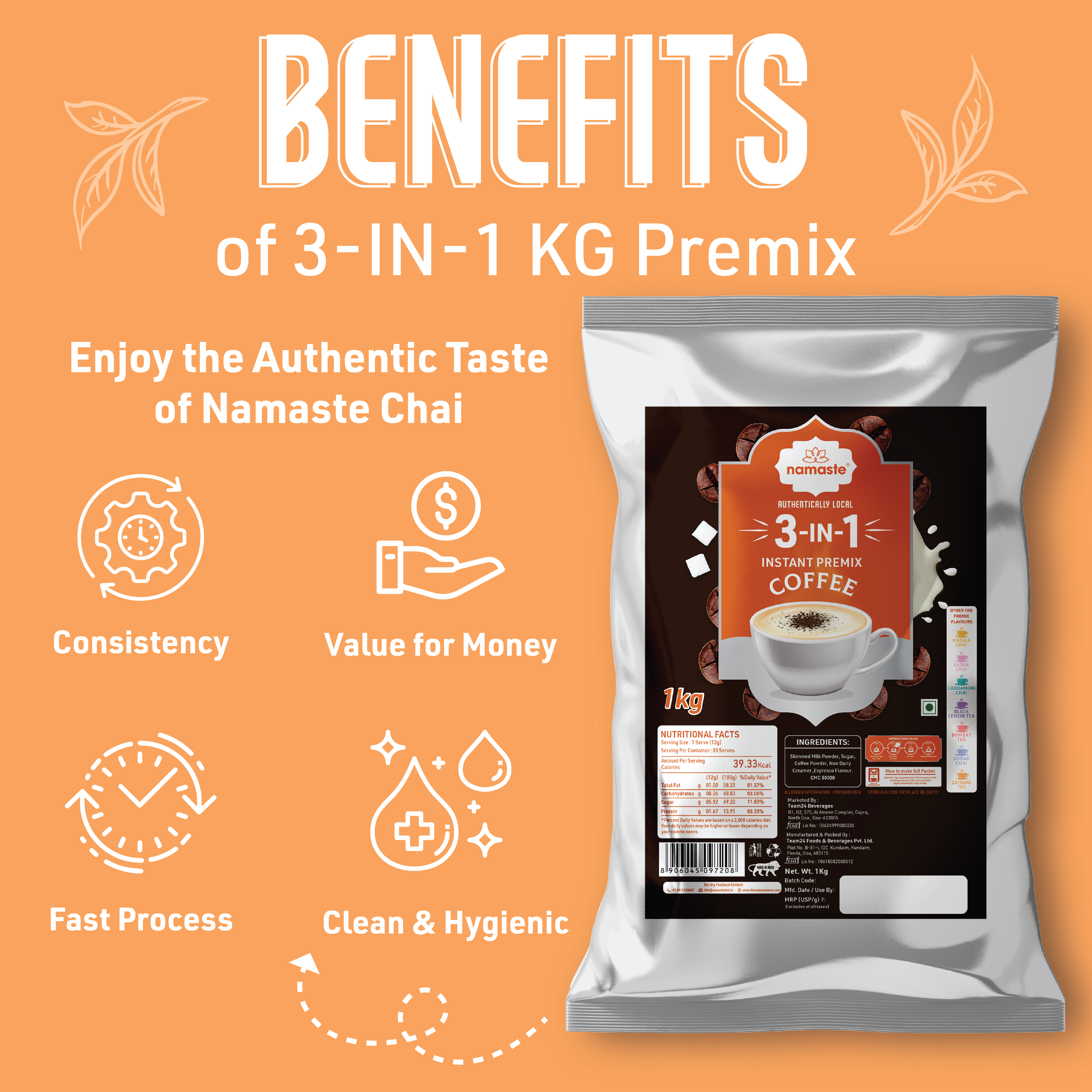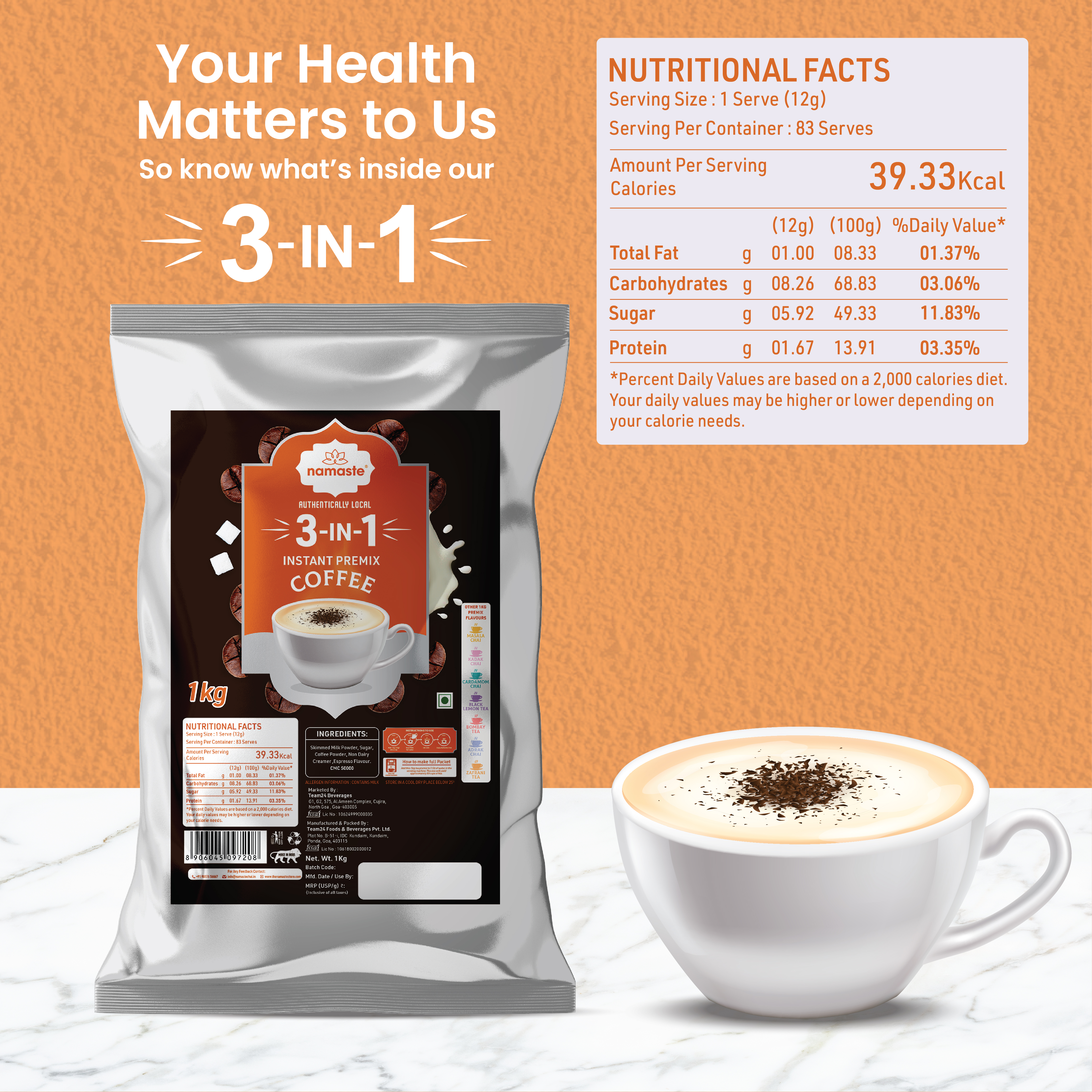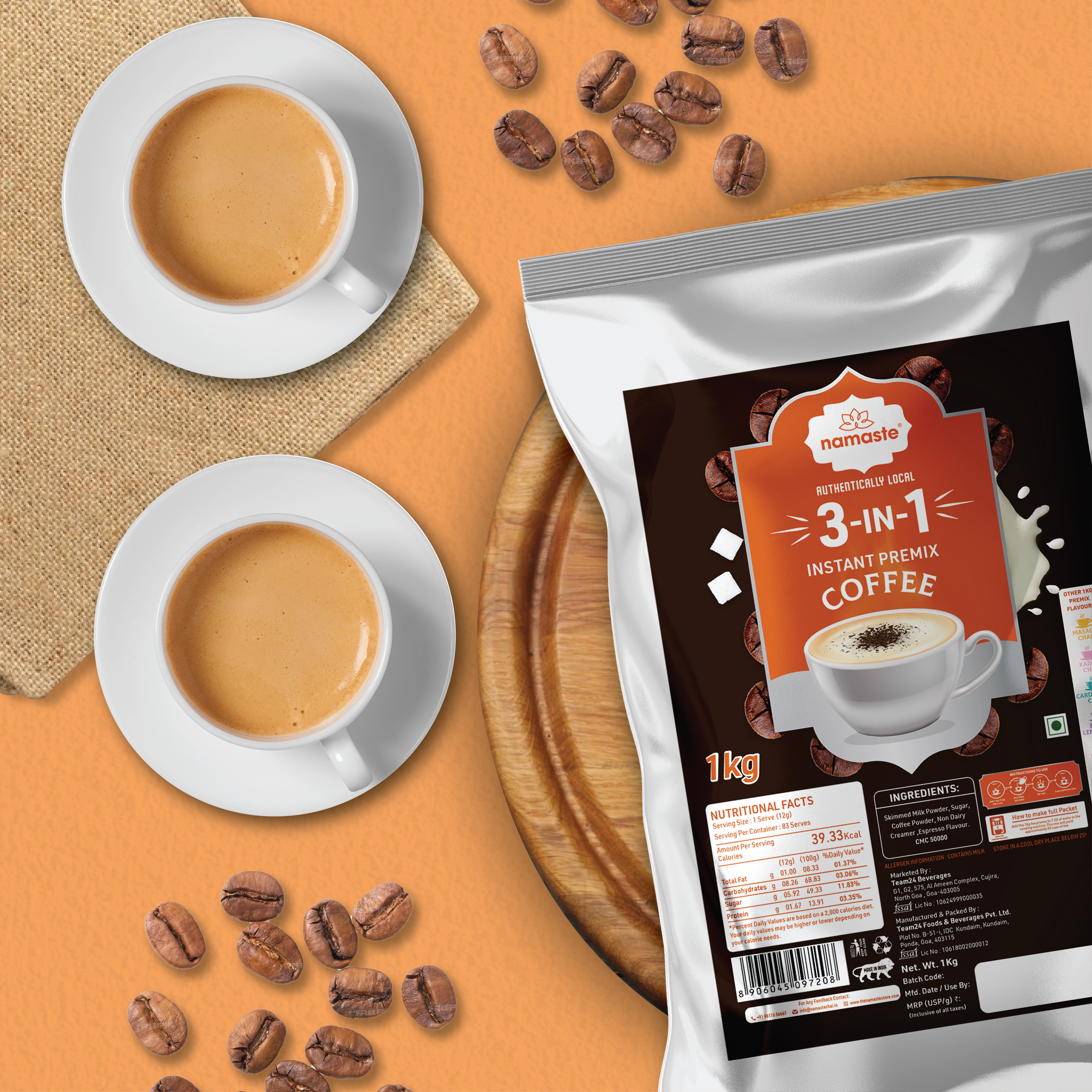 Namaste chai premix coffee adds a great taste to the your hot beverage made with pure ingredients. Its finest ingredients is good for taste, just add hot water and make your coffee in just few seconds. Make your day easy and energetic with namaste chai instant premix coffee.