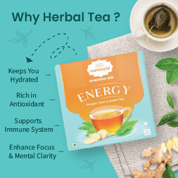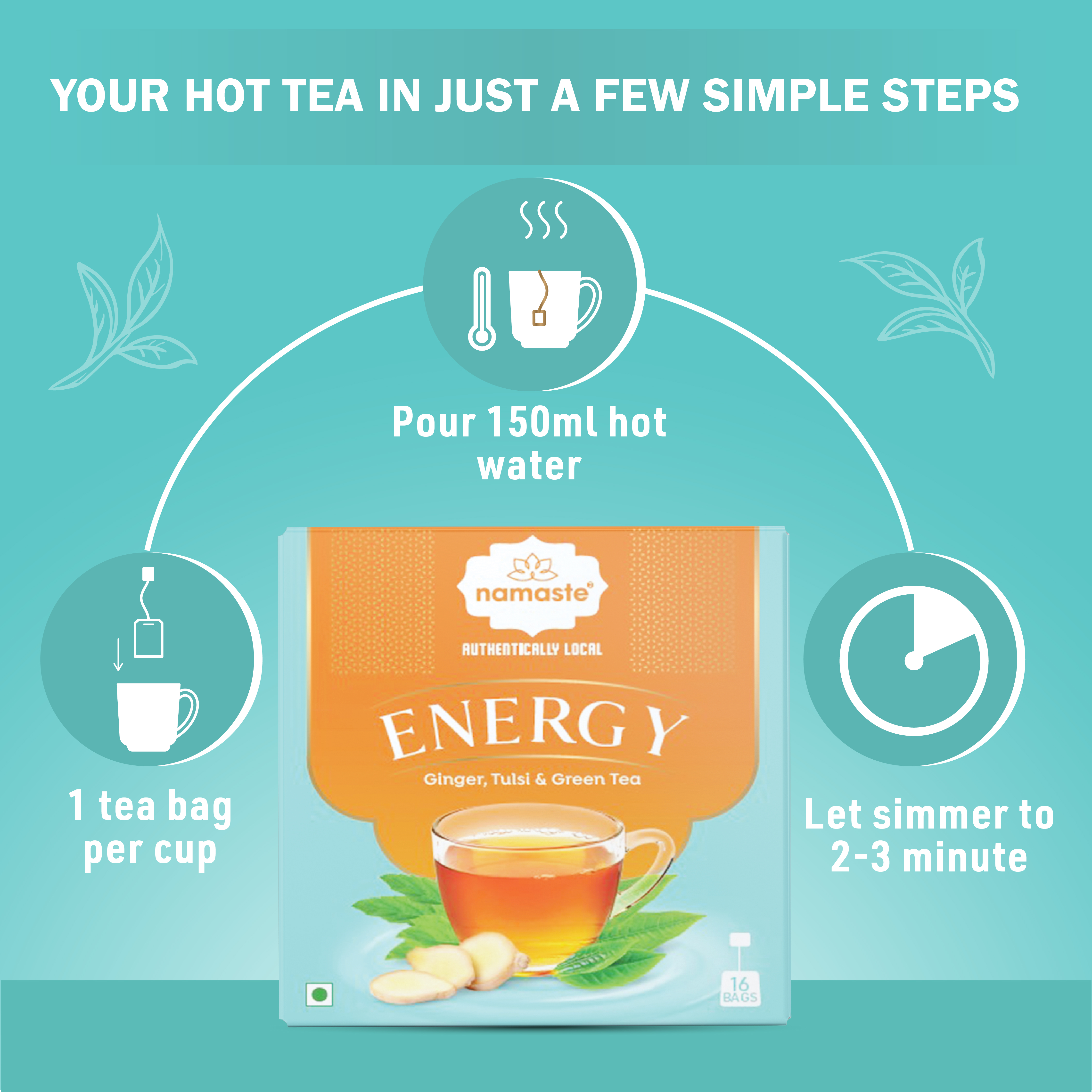 Namaste Chai Energy Herbal Tea - Ginger, Tulsi & Green Tea is stress relieving and harmonizing. We bring to you a premium range of tea that is carefully picked and methodically processed. This tea is a perfect starter for a bright new day. The excellent quality of the tea leaves, magnetic aroma and strong flavour set this tea apart. This tea will energize and refresh everyone. It has a fresh taste that makes it a perfect treat for your taste buds. It is authentic and flavourful. It has many health benefits. This tea is caffeine and gluten free.